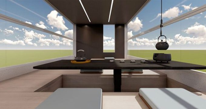 Les 12 m2 disponibles sur le toit du véhicule, baptisé Sunroom, sont mis à profit à l'avant pour un petit balcon (2 m2) et une terrasse (10 m2). Cette dernière est protégée par des parois transparentes pour être utilisée par tous les temps pour s'y reposer ou s'y restaurer grâce à une table sur pied télescopique.