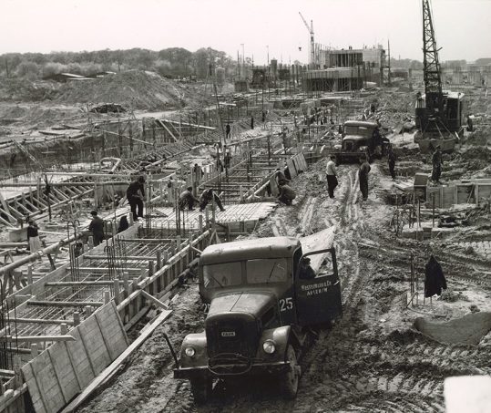 La construction de cette usine a démarré pendant un hiver particulièrement rigoureux avec 372 employés. Fin mars 1955, un millier d’ouvriers s’activaient déjà sur le site de construction. Alors que le dégel s’annonçait, des planches devaient être installées sur le sol boueux pour que les camions puissent continuer à livrer les matériaux de construction. Sur le site même, une petite ville de fortune se crée avec des bureaux, des abris pour les fournitures, des cabanes pour les logements et des tentes en guise de réfectoire. Des commerçants viennent également s'y installer.