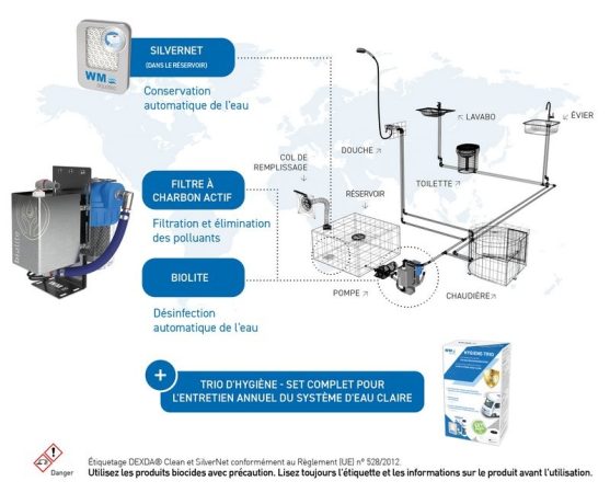 La « solution complète pour l'hygiène de l'eau » a été conçue de telle sorte qu’elle peut être installée sans problème dans presque tous les véhicules de loisirs. Tous les composants sont préinstallés sur un support de montage au sol en acier inoxydable, qui ne nécessite qu'une alimentation électrique et un raccordement du côté de l'eau. Les accessoires inclus dans le contenu de la livraison tiennent compte des différents diamètres des tuyaux possibles, ainsi que des différentes pompes – submersibles ou à pression – installées dans les véhicules. Si vous ne voulez pas l’installer vous-même, vous pouvez bien sûr le faire installer par votre concessionnaire camping-car. Cette solution complète est disponible à partir de 774 € (prix TTC du fabricant). Tous les articles installés dans la « solution complète pour l'hygiène de l'eau » peuvent, bien entendu, être achetés séparément dans des magasins spécialisés ou en ligne.
