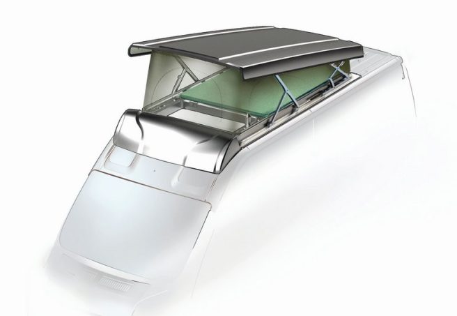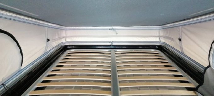 Le toit Pop-Up « Vela » de Lippert, développé et fabriqué en Europe, est construit grâce à la technique du thermoformage twin sheet. Robuste et léger, ce toit à soufflet est le plus léger de sa catégorie et il est plus grand que la moyenne : il contient un lit double de 200x130 cm desservi par la canalisation d’air chaud et/ou froid.