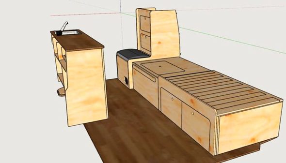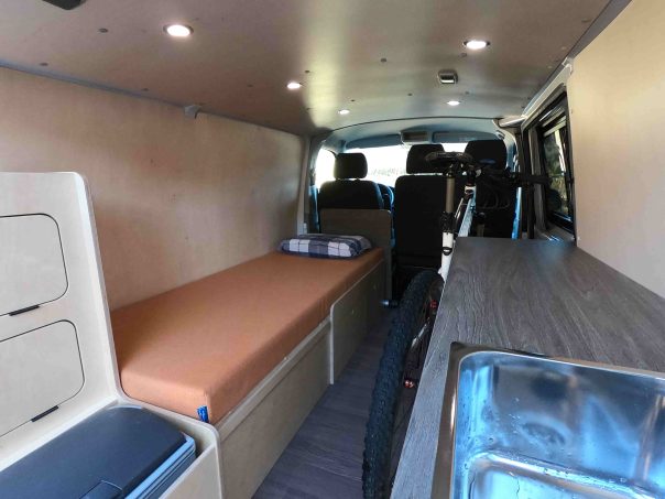 - Le plan Yvan (Type A), dès 6 900 €, offre un lit simple de côté, transformable facilement en lit double (185 x 125 cm) en l’étirant latéralement. Avec une personne à bord, on peut y ranger un vélo durant la nuit. Il reçoit en plus un meuble de cuisine accueillant un évier, un tiroir avec réchaud gaz, une niche de rangement et quatre placards contenant deux réservoirs (19 l d’eau propre et 13 l pour les eaux usées) et le tableau électrique. Le réfrigérateur Dometic CDF18 s’ouvre par le dessus. L’habillage des parois et du plafond est constitué de contre-plaqué boulot en finition vernis mat. Le plancher fait appel à un revêtement de sol vinyle. La table, avec plateau en stratifié, repose sur un pied amovible.