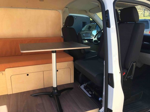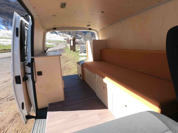 - Le plan Véronique & Christophe (Type B), dès 7 400 €, propose un couchage généreux en long (190 x 130 cm) avec une partie du lit reposant sur des coffres profonds à ouverture en façade, et une autre sur un coffre complété par le plateau table. Son matelas en Bultex reçoit 2 cm de mousse viscoélastique pour un meilleur confort. Un réfrigérateur Dometic CRX50 est intégré dans la colonne de rangement arrière. Un espace est prévu pour un WC portatif, accessible de jour comme de nuit. Le bloc cuisine intègre un évier (alimenté en eau par deux réserves de 12 l), un réchaud et des placards. Le pied de la table amovible utilise une embase encastrée.