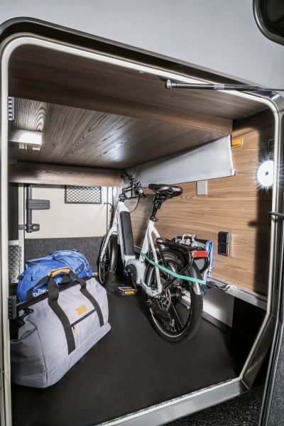 Le garage décaissé en PRV le prouve en revendiquant jusqu’à 450 kg de chargement maximal, soit un volume de près de 3800 l. Impressionnant ! Avec son innovant châssis SLC, Hymer a souhaité disposer d’un centre de gravité le plus bas possible. L’objectif est évidemment de réduire le phénomène de roulis et de garantir une excellente tenue de route. Un phénomène également accentué par les suspensions individuelles des roues plus efficaces qu’un essieu rigide. En associant la technicité du châssis SLC aux prestations du Mercedes Sprinter, Hymer marque les esprits.