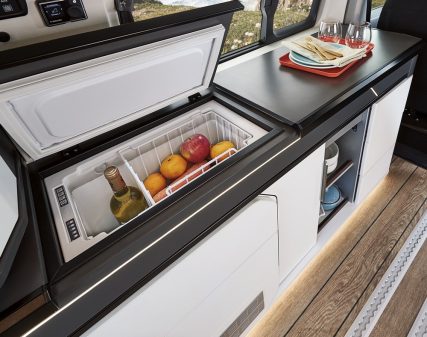 Campérêve abandonne donc la teinte bois pour venir sur quelque chose de plus neutre et épuré. On retrouve d'un côté un réchaud 2 feux et un évier discrètement dissimulés sous le plan de travail relevable. De l'autre, un petit frigo à compression de 35 l permet de garder des aliments au frais. Le sol reprend un coloris boisé pour apporter une touche de chaleur dans ce véhicule. Vous aurez en revanche le choix de série entre une sellerie foncée Fuji (tissu/tep) ou claire Arizona (Tep).