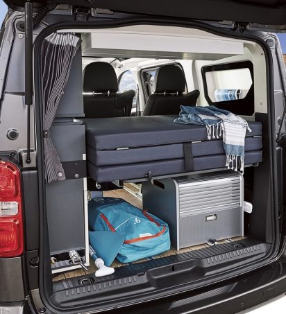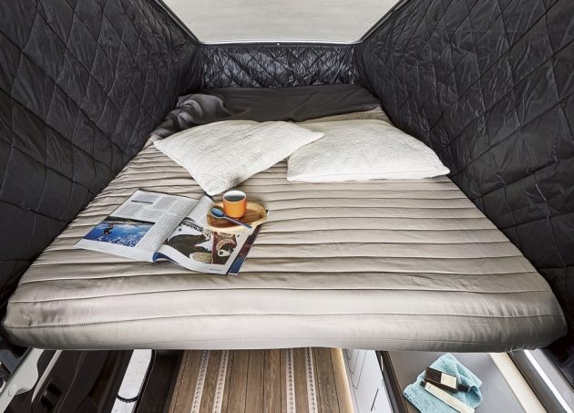 Cet partie relevable dissimule un matelas de 115 x 191 cm reposant sur un sommier à assiettes Fröli. En partie basse, les sièges de l'habitacle se rabattent et un lit articulé présent dans le coffre permet de profiter d'un couchage d'appoint de 115 x 192 cm également. La mise en place des deux literies est simple et rapide. A noter d'ailleurs que le toit relevable bénéficie d'un verrouillage centralisé efficace et surtout plus fonctionnel que d'autres modèles concurrents.