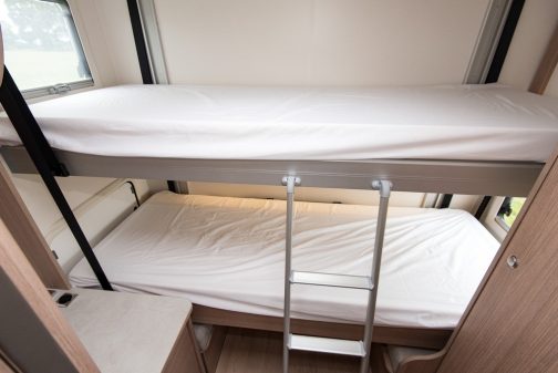 Au plafond, ce SC700 profite en effet de deux couchages électriques qui se superposent. Leurs dimensions : 73 x 200 cm. Si adultes et enfants bénéficient d'espaces indépendants, en revanche il faut se partager la salle d'eau. Cet intégral dispose d'un cabinet de toilette séparé de la douche. Toutefois, cette zone peut être réuni par un jeu de cloisons coulissantes. Côté autonomie, ce SC700 loge deux réserves d'eau propre et d'eaux usées de 120 l.