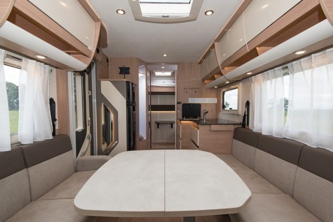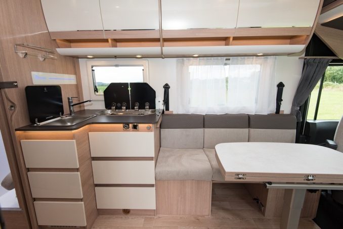 Rares sont les constructeurs à proposer l'ensemble de son catalogue autour des 60 000 € avec, qui plus est, une motorisation standard de 140 ch. C'est par exemple le cas du SC700 qui est commercialisé à 60 500 € exactement et qui séduit les familles par son implantation atypique dans seulement 6,99 m de longueur. A bord, les ingénieurs ont opté en partie avant pour un très grand salon. Imaginez que les responsables de la marque n'hésitent par à revendiquer un coin repas pour 7 personnes. Il sera donc possible d'accueillir quelques convives pour l'apéro ou un repas, car sur route ce modèle reste homologué pour 4 de base. A noter qu'une cinquième place CG est disponible en option.