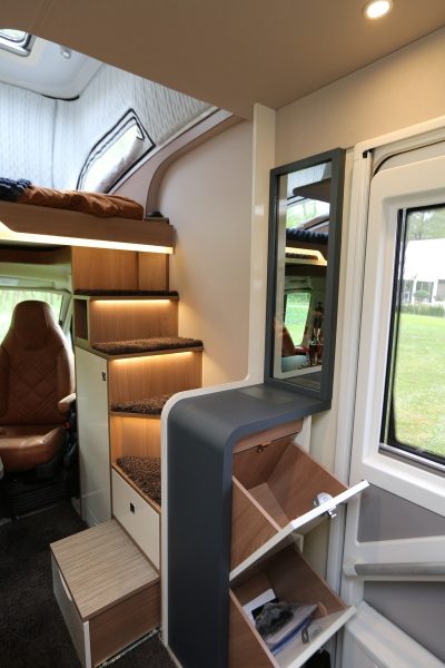 A bord, Bürstner conserve ces exigences en matière de bien-être avec un habitacle flatteur et agréable à vivre. Les escaliers qui permettent de monter facilement dans le couchage "en capucine" servent également de rangement. Une manière d'optimiser habilement et élégamment les espaces.