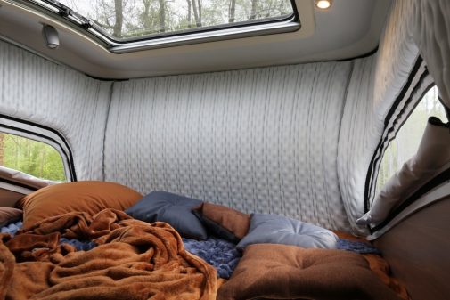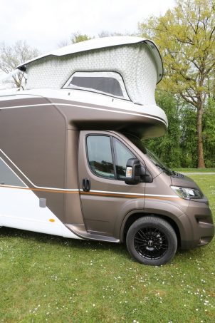 Ce profilé dissimule donc un toit relevable de type pneumatique qui se relève grâce à de l'air comprimé et qui n'est pas sans rappeler le prototype Hymer VisionVenture présenté par le groupe éponyme (dont Bürstner fait partie). Un compresseur logé dans la soute souffle de l'air à une pression de 0,2 bar, ce qui permet de gonfler l'armature en seulement 90 secondes, durée vérifiée par nos soins. A noter qu'un capteur mesure en continu la pression et la maintient en permanence.