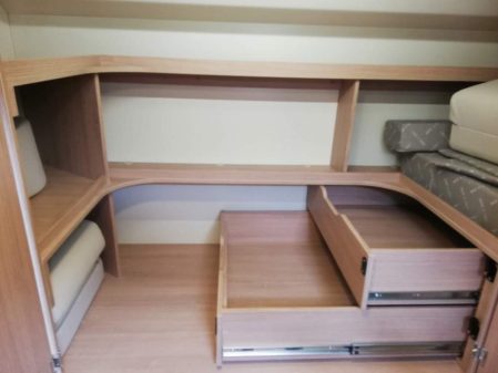 Et au centre, une large zone pour pouvoir se sécher ou s'habiller avec en prime un superbe accès à un grand dressing. Ce dernier dispose d'étagères et de tiroirs à l'anglaise afin de compartimenter au mieux ce placard de rangement. A noter que ce PC640 profite également d'une soute qui ne brille pas par sa largeur mais qui a le mérite d'être présente et facilement accessible via les portillons extérieurs mais aussi par la trappe intérieure.