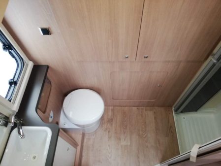 Mais rassurez-vous, il s'agit d'un lit secondaire car le principal se situe en pavillon. Ce PC640 bénéficie d'un couchage double électrique de 149/125 x 192 cm. Cette nouveauté autorise donc un programme pour 4 personnes aussi bien sur route qu'à l'étape. En partie arrière, pas de surprise sur ce type d'agencement. Itineo fait comme la concurrence en proposant une salle d'eau occupant toute la largeur du véhicule. On retrouve côté conducteur une vaste douche parfaitement isolée. A l'opposé, le lavabo et le WC se partage l'espace.