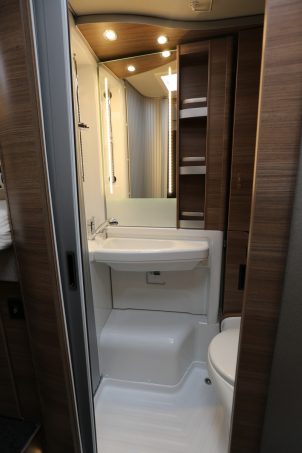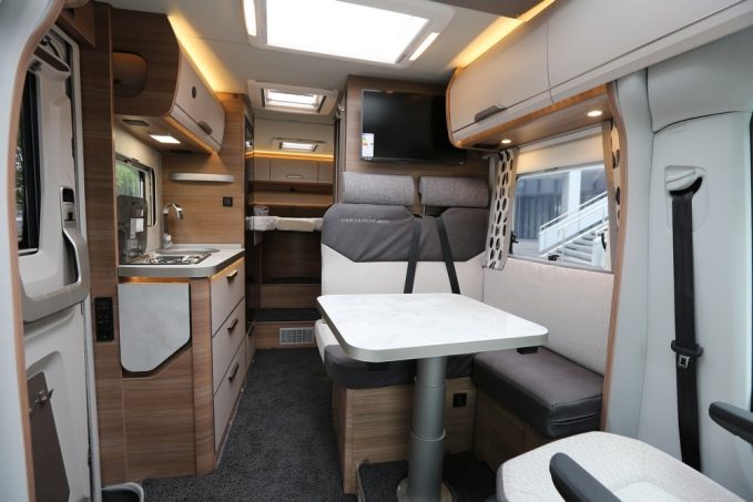 A bord, la chambre propose également une belle capacité de rangement à la fois en pavillon avec les placards haut, mais aussi sous les sommiers avec les discrètes penderies. Sur ce véhicule compact, Knaus opte pour une salle d'eau à paroi pivotante afin là aussi, d'optimiser l'espace au profit de la chambre et du salon également. Sur ce registre, la dînette se montre aérée et bénéficie d'une bonne luminosité grâce au skyroof. Ce coin repas se compose d'une banquette avec retour en L et des sièges du porteur MAN pivotant. Dommage en revanche que le plateau de table soit si petit. La cuisine profite d'un bloc droit avec réchaud 2 feux, évier circulaire sans oublier l'intégration d'un frigo de 142 l.