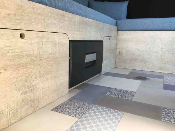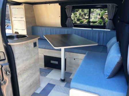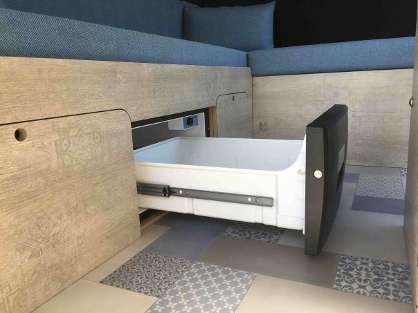 Le modèle, ici présenté, a été développé à partir d'une version utilitaire avec trois places carte grise. Faute de pouvoir monter une embase pivotante pour la banquette biplace passager, l'espace derrière la cabine reçoit un grand coffre de rangement sur toute la largeur. Il est accessible par le dessus ou sur le côté, via un portillon. En plus d'offrir un beau volume de rangement (215 l), ses 1,60 m de longueur autorise le stockage de deux snowboards). Dans la journée, ce coffre fait office de banquette. Le soir, il se transforme en couchage (183 x 120 cm) grâce à un astucieux système de sommier coulissant (en tirant la partie peigne de la banquette). Le reste de cet aménagement comprend un réfrigérateur tiroir de 30 l (Dometic) et deux espaces destinés aux rangements. Le meuble de cuisine reçoit un évier avec un robinet. Le tout est connecté à deux jerricans (19 l pour l'eau claire - 13 l pour les eaux grises). On y trouve en plus un tiroir avec un réchaud à gaz et quatre placards.