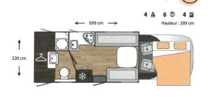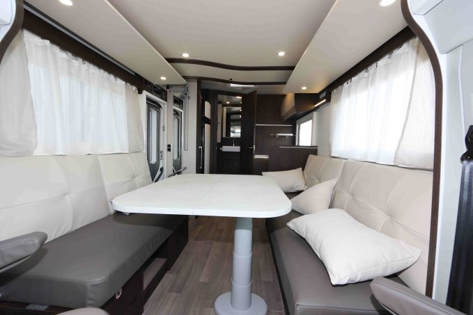Les occupants disposent de deux grands lits. Le couchage permanent se situent en hauteur, au-dessus du living. Il s’abaisse facilement en actionnant un interrupteur placé sous le support du sommier. Les dimensions de ce lit sont géantes : 160 cm de large aux épaules et près de 2 mètres de long. La dînette se convertit en lit supplémentaires pour deux occupants. Sa transformation est relativement rapide. Mais pour l’utiliser, il sera nécessaire d’abaisser le couchage de pavillon à mi-hauteur.