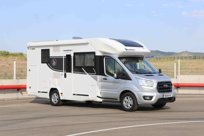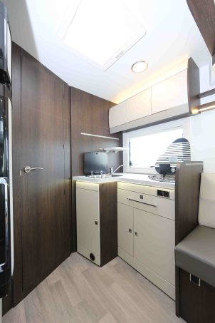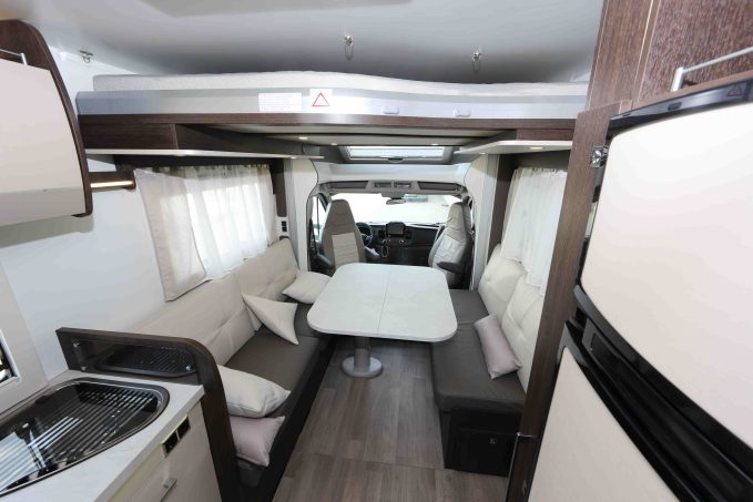 Comment faire tenir confortablement quatre personnes dans un profilé compact ? Bénimar a trouvé la solution avec le Tesssoro 488. Ce modèle sur Ford Transit, animé de série par le bloc 130 ch (le 170 ch et la boîte automatique sont disponibles en option contre 1320 € ou avec le pack Northautokapp vendu 5700 €) reçoit un aménagement qui autorise à vivre à quatre sans se bousculer. Mieux encore, le vaste salon face/face permet de recevoir deux convives pour l’apéro ou le repas. Le bloc cuisine, dans le prolongement de la banquette de gauche est bien fourni en rangements. Face à lui se trouve le réfrigérateur à absorption de 140 litres.