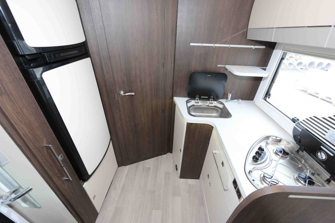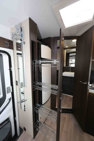 La particularité du Tessoro 488 tient dans sa partie arrière occupée par la salle d’eau. Cet espace est vaste et très bien agencé. On y trouve notamment un lavabo central très pratique surmonté d’une porte miroir qui s’ouvre sur un immense placard équipé de deux tiroirs en fil de fer. Un triroir vertical également très pratique jouxte ce volume. A gauche du lavabo, loge la penderie. Celle-ci est coulissante facilitant son usage et la suspension des vêtements.