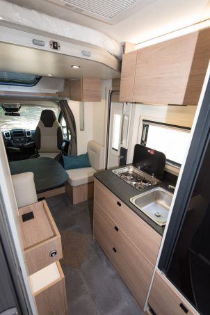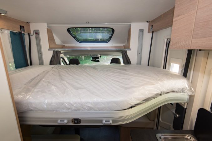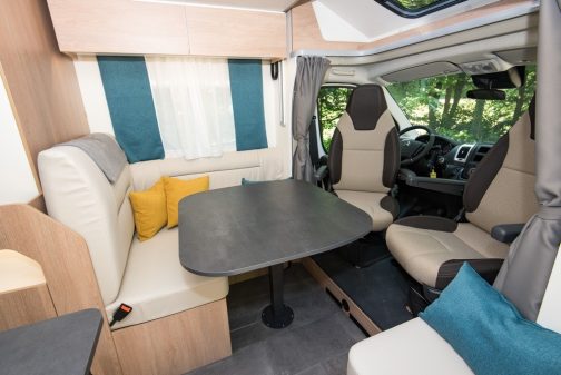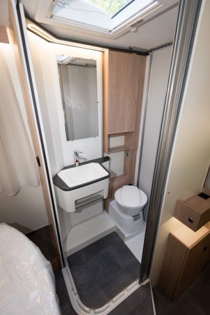 La capacité nocturne de ce profilé est variable. On peut y dormir à deux dans la configuration de base, grâce au grand et confortable lit central. Pour un accueil nocturne pour quatre personnes, il faudra réclamer l’option lit de pavillon. Et pour recevoir un cinquième hôte, vous devrez transformer la dînette en couchage (possible avec un pack). La salle d’eau est une “2-en-1” : le cabinet de toilette se convertit en cabine de douche en pivotant la cloison sur laquelle repose le lavabo (celui venant se positionner au-dessus des WC).
