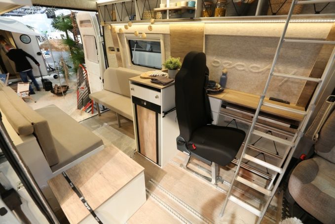 Dans un fourgon de 5,41 m sur base Citroën, Hobby propose un version dite Beachy. Un véhicule relativement disposant d'un aménagement modulable. La dînette arrière laisse place à un lit double qu'il faut confectionner. Ce véhicule peut recevoir jusqu'à trois assises dans l'habitacle homologuées pour la route.
