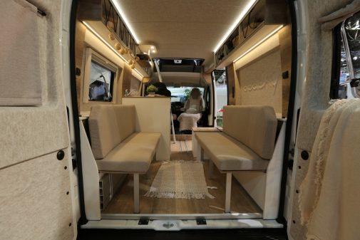 A l'étape, la partie arrière profite de banquettes latérales en vis-à-vis agrémentée d'une table centrale amovible. Cette dernière sert aussi de plateau en partie avant. Si elle peut convenir pour un coin repas, c'est sans compter sur la dînette arrière qui s'avère plus spacieuse et agréable. Pour continuer dans un esprit de modularité, cette zone se transforme, la nuit, en chambre. Pour cela, il faudra procéder à de petites manipulations. Enlever les coussins des assises et la structure portante pour loger des barres aluminium dans les espaces dédiés, puis dérouler les lattes en bois habilement rangées dans les flancs du véhicule. Toutefois, un lit dans le toit relevable est également à disposition et s'installe plus rapidement. Ce Beachy Van apporte donc des solutions nouvelles dans l'univers du fourgon avec un modèle épuré, fonctionnel et polyvalent. En témoignent les étagères ouvertes en partie haute, remplaçant les classiques placards avec porte. Face à l'engouement suscité sur son stand durant le salon de Düsseldorf, Hobby entend bien commercialiser rapidement ce Beachy Van. Affaire à suivre...