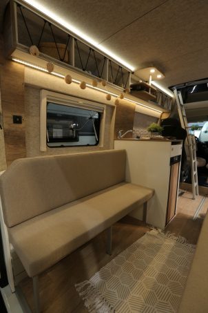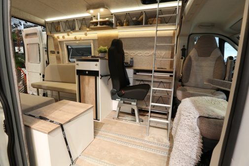 A tel point que ce Beachy Van se passe d'un réel cabinet de toilette. Les ingénieurs ont opté pour un WC Porta Potti, dissimulé dans un caisson. L'espace de vie est ainsi privilégié. Le bloc-cuisine est réduit à sa plus simple expression avec la présence d'un évier, d'un frigo à compression et d'un réchaud extractible logé dans un tiroir. Le salon joue la carte de la polyvalence puisque les rails au plancher peuvent accueillir un, deux ou trois sièges individuels homologués, par ailleurs, pour la route. En plus des places du poste de conduite, ce fourgon peut donc prétendre à 5 personnes à bord en parfaite sécurité.