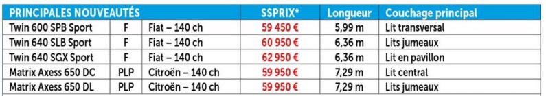 Avec un premier travail entrepris sur les Coral et Matrix (Plus et Suprême), Adria poursuit le développement sur les Matrix Axess devenus désuets. Nouvelle casquette de profilé avec large sky roof, face arrière épurée, lit de pavillon plus léger et discret, les Axess font peau neuve avec en prime une ambiance de mobilier plus contemporaine. Au-delà de ces changements majeurs, deux implantations font également leur apparition dans cette entrée de gamme. Sur des longueurs de 7,29 m, Adria mise sur un salon face-face, une salle d’eau traversante et des lits jumeaux pour le 650 DL ou un lit central pour le 650 DC. Première porte d’entrée dans l’univers des profilés à lit de pavillon, ces Axess sont proposés à 59 950 € sur Citroën exclusivement.