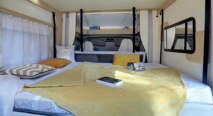 Au-dessus du salon, se trouve le lit permanent plaqué contre le pavillon. Ce couchage monte et descend à l'aide d'un moteur électrique. Trois niveaux sont prévus.