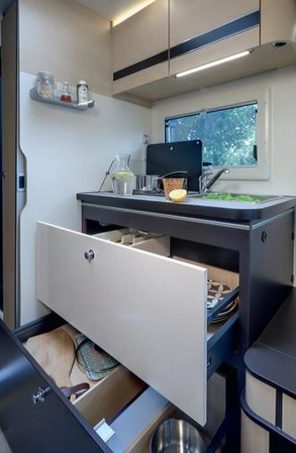 La cuisine est installée à gauche, dans le prolongement de la banquette. Le meuble peut recevoir une tablette coulissante sur deux côtés pour augmenter la surface du plan de travail. Face au bloc-cuisine se trouve le réfrigérateur, un modèle slim à absorption de 141 litres.