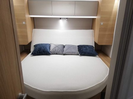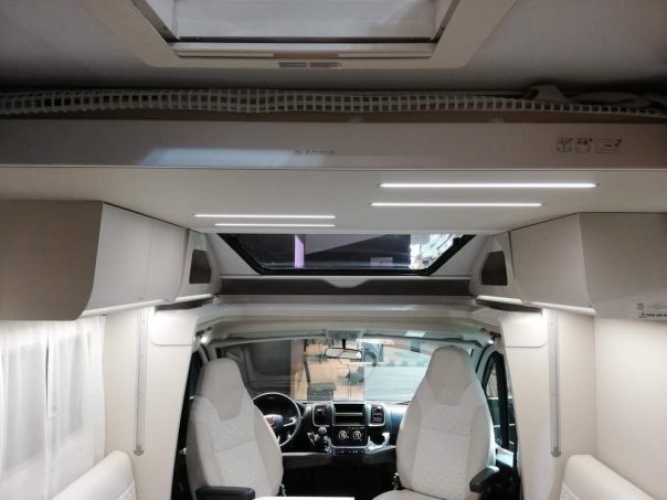 Ce profilé de 7,29 m de longueur dispose dans son habitacle d'un superbe salon. Adria opte ici pour des banquettes en vis-à-vis et une large table rabattable de moitié. Ce coin repas est surmonté de base par un lit de pavillon électrique de 125 x 200 cm. En revanche, le couchage principal est axé sur un lit central logé en chambre arrière.