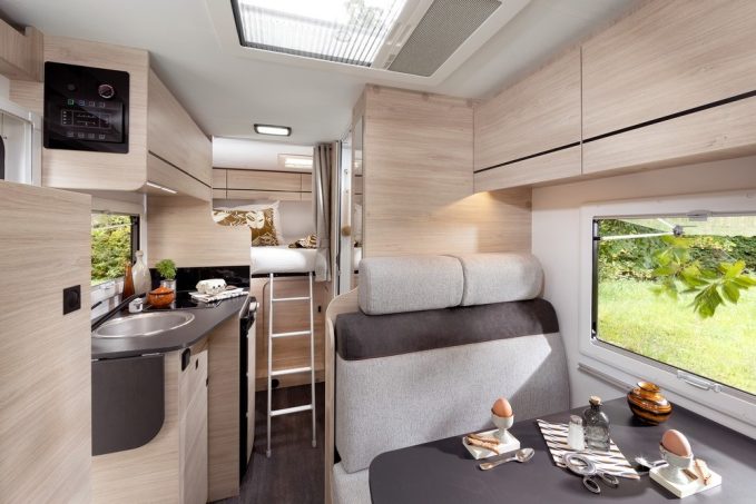 En dehors de l’espace nuit, ces deux profilés hybrides partagent une implantation commune pour le reste de l’habitacle. Ainsi, la partie avant est dédiée au salon avec les sièges pivotants de la cabine associés à la banquette face route. La cuisine est positionnée au centre du véhicule et fait face à la salle d’eau. L’optimisation de l’espace a été privilégiée sur ce poste sanitaire avec l’incontournable paroi pivotante permettant ainsi de passer d’un cabinet de toilette à une grande douche.
