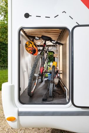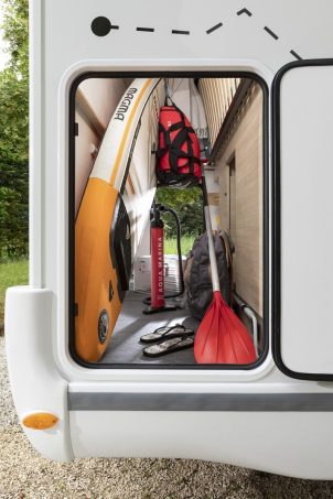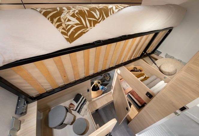 Ces deux couchages indépendants de bonnes dimensions peuvent également se réunir pour ne former qu’un. Le S194 profite pour sa part, en partie arrière, d’un lit transversal avec un sommier « papillon ». Un terme poétique certes, mais le dispositif se veut avant tout fonctionnel. En d’autres termes, le lit peut se relever des deux côtés, soit pour accéder aux discrets rangements logés dessous, soit pour agrandir la soute garage.