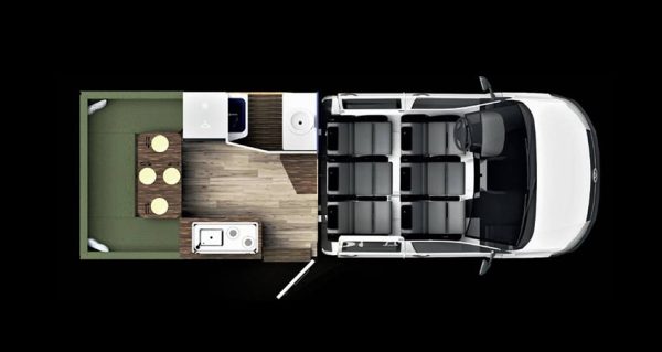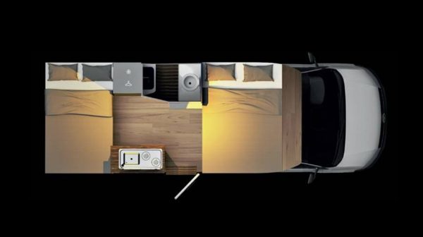 C'est avant tout au niveau de sa cabine et de sa cellule, qu'il se démarque de la concurrence. Ce modèle repose sur un châssis à double cabine de Volkswagen Transporter, doté de quatre portes d'accès. Habituellement, ce type de châssis est plutôt utilisé pour des véhicules de chantier, avec une benne basculante, que pour des camping-cars.