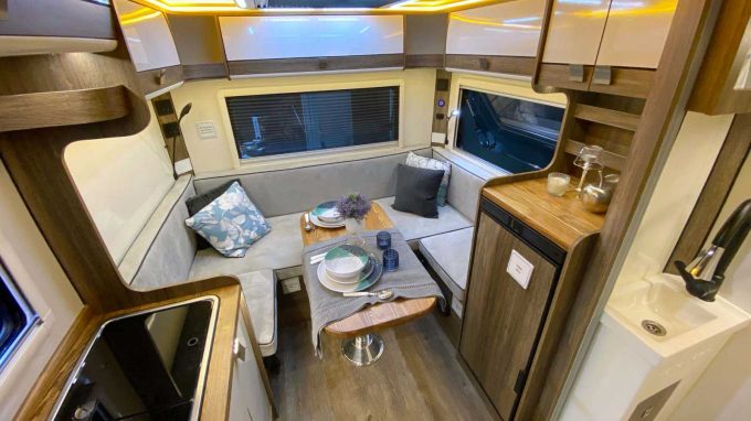 La partie arrière, qui accueille une généreuse banquette en U, peut en effet se convertir en grand lit (120 x 193 cm), une fois la table abaissée et un coussin d'appoint ajouté dessus.
