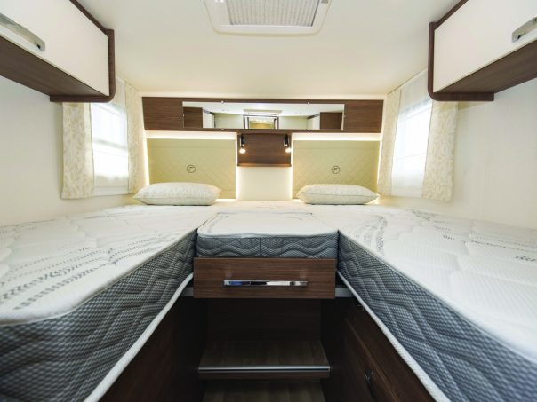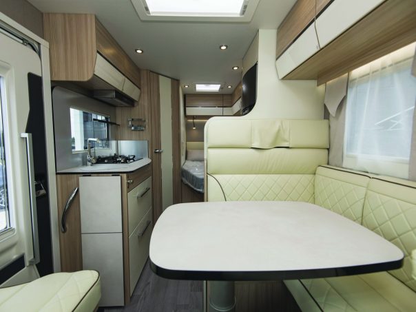 Un Baxter (64 LDF) peut recevoir, en option, un toit relevable, comme sur un fourgon, pour augmenter la capacité de couchage qui passe alors de trois à cinq. Un nouveau modèle apparaît au sein des profilés compacts : le Baxter 68 LMC. Dans un gabarit court (6,85 m) et étroit (2,23 m), nous trouvons un salon pour six personnes, une petite cuisine, une salle d’eau astucieuse avec lavabo escamotable, et un lit central.