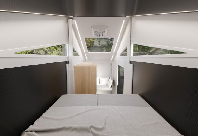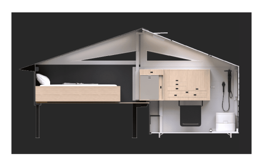 Sa partie avant accueille un grand couchage, pour deux personnes. Sa partie postérieure est dédiée elle aux commodités. Un meuble latéral intègre de nombreux tiroirs dont un dissimulant un évier et un réchaud à induction double feux sans oublier un mini réfrigérateur Dometic. A l’arrière, l’espace comprenant une banquette et une table repliable, pour les repas, peut aussi se transformer en coin WC et en douche. La ventilation et le chauffage sont assurés par un système de convection placé au centre de la cellule. Des extensions en toile sont prévues, sur les côtés, pour accroître l'espace de vie.