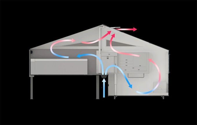 Pour son fonctionnement sont prévues des réserves d’eau propre et grise, placées sous le lit d’une capacité de 50 gallons (189 litres). Un système d’osmose inversée permet également d'assurer sa purification. Côté alimentation électrique, cette cellule dispose d’une batterie lithium-ion de très forte capacité (300 Ah) reliée à des tuiles solaires spéciales Solar Proof, de Tesla. Celles-ci fonctionnent même quand il neige en inversant son processus pour la faire fondre. Plutôt ingénieux.