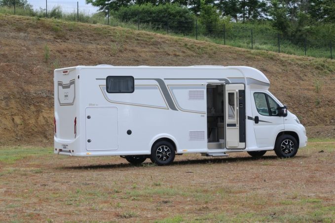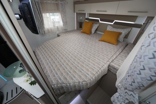 Ce véhicule affiche une longueur de presque 7,50 m tout de même et devient donc la sixième proposition dans la série Progress. Ce gabarit permet ainsi de tirer profit au maximum d'un agencement aéré. En chambre, le lit repose sur un sommier à lattes et bénéficie de dimensions de 150 x 195 cm. Il est bordé en tête par deux penderies et des placards de pavillon.