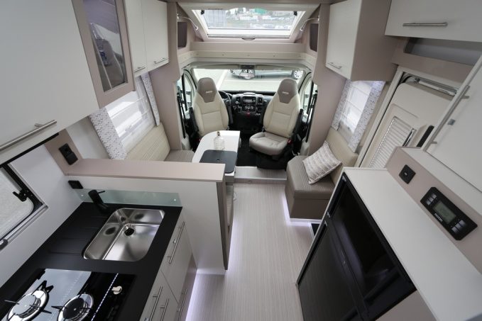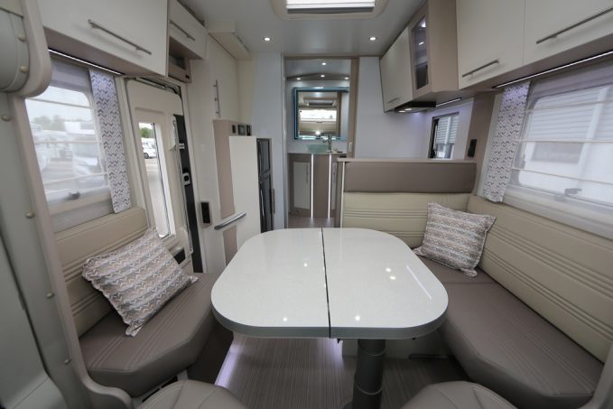 Au niveau du salon, ce Bilbao BCL mise sur une dînette en L avec sofa latéral. A l'étape, ce poste est censé pouvoir accueillir 5 convives autour de la table centrale. A noter que le coin salon peut être surmonté d'un lit de pavillon électrique proposé en revanche en option. Derrière le dossier de banquette se trouve la cuisine. Fidèle à l'ADN Notin, elle est flatteuse en plus d'être fonctionnelle. Le magnifique revêtement noir en Polyrey se distingue de l'ensemble du mobilier. On y retrouve une cuve inox carré et profonde avec un dessus d'évier faisant office d'extension de plan de travail. Pour la cuisson, ce Bilbao opte pour un réchaud 2 feux affleurants. Les rangements ne manquent pas et cette cuisine est équipée également d'un frigo de 153 l avec un compartiment congélateur indépendant.