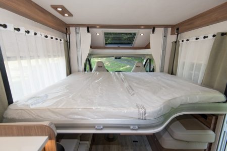 Au-dessus du salon se trouve le grand lit permanent. Plaqué au pavillon, il descend très bas. On peut alors s’y asseoir avant de s’allonger. Le matelas est épais, réalisé dans une bonne mousse (type Bultex) et repose sur un sommier à lattes. Deux hauteurs s’offrent aux utilisateurs : tout en bas quand le véhicule est utilisé par un couple seul, ou à mi-hauteur lorsqu’on transforme la dînette en couchage (option).