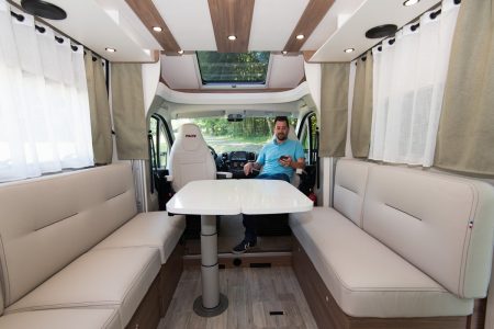 Le salon est très grand, les banquettes en vis-à-vis sont longues. Celle de gauche se transforme en deux places route. La première face à la chaussée, la seconde lui tournant le dos. Les personnes qui y prennent place profitent du paysage qui défile derrière la grande baie. A l’étape, chacun trouvera facilement une place, soit sur ces banquettes, soit sur les sièges de cabine pivotant. Pour améliorer la circulation de l’avant vers l’arrière, le grand plateau de table se plie par le milieu, façon portefeuille.