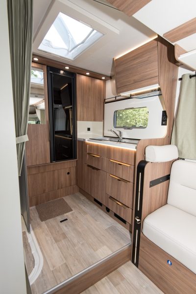 Le bloc-cuisine forme un L. Il est installé en bout arrière de la cellule et compte de multiples rangements. Pilote a même prévu un logement pour four à micro-ondes (quand le camping-car est connecté au réseau électrique). Le réfrigérateur à absorption, trimixte, est inséré entre le bloc-cuisine et la penderie, laquelle surmonte le garage à vélos. Dans la continuité, sur la gauche, se trouve le cabinet de toilette, convertible en salle d’eau ou en cabine de douche grâce à la paroi pivotante. L’ensemble cuisine et salle d’eau est monté sur une estrade, ce qui permet de créer un double-plancher où ranger des paires de chaussures.