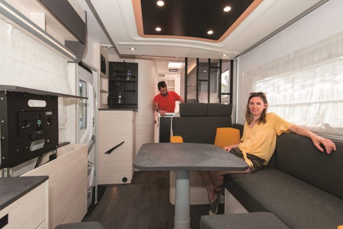 Réduire l'offre et les gabarits. La marque maintient ce cap puisque le 240 est positionné sous la barre de 7 m. Ce modèle est intégré à la “famille des maxi-­salons”. Son plan se distingue par un coin repas qui peut accueillir huit personnes avec la banquette en L et des “poufs” qui peuvent soit s’aimanter au salon pour former un U, soit être positionnés ailleurs dans l’habitacle. Le meuble de droite accueille un écran de télévision escamotable, de 32 pouces maximum.