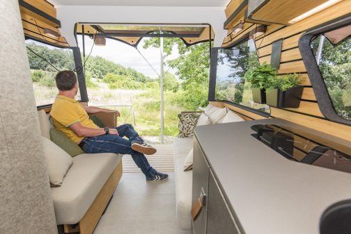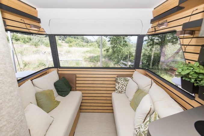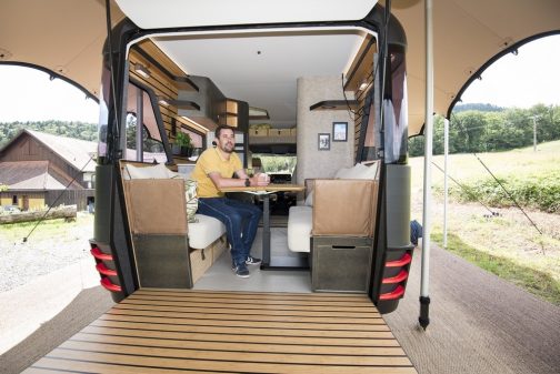 Ce prototype se distingue par sa partie arrière qui s’ouvre totalement sur l’extérieur, à la manière d’un yacht grand luxe et de sa plage de bain. L’Hymer Vision Venture dispose lui aussi de sa plateforme en teck par laquelle il est possible de monter à bord grâce à une échelle escamotable. Sur cette même partie arrière, se trouve un vaste salon avec des banquettes en vis-à-vis sur lesquelles il est intéressant de se pencher car elles dissimulent des éléments clés...
