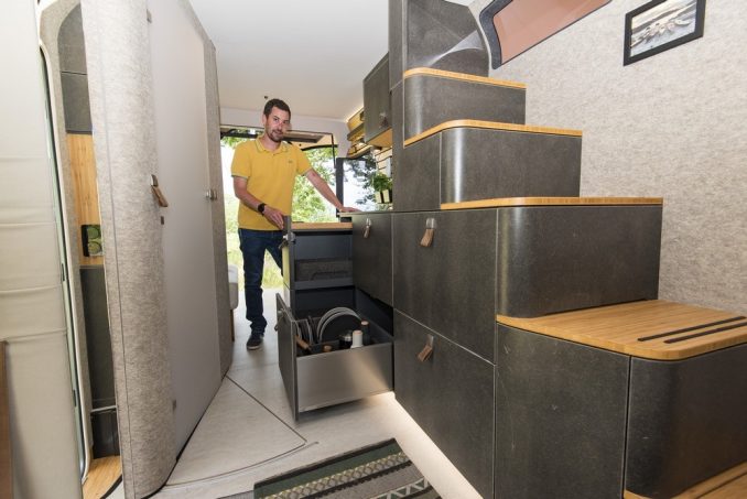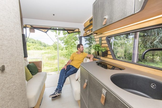 En premier lieu, la table mais aussi une véritable cuisine extérieure qui coulisse sur la « terrasse » et qui permet de profiter d’une plancha et d’un jeu d’ustensiles à barbecue (pic, couteaux…) caché sous la planche à découper. Pour autant, ce Hymer Vision Venture profite d’une cuisine dans l’habitacle. Cette dernière affiche un joli design et surtout une grande capacité de rangements avec la vaisselle astucieusement bloquée dans des casiers dédiés. Cette armoire de cuisine sert également d’escalier pour « monter à l’étage » et accéder à la chambre. En effet, ce prototype profite d’un toit qui se relève grâce à une toile… gonflable. Ce dispositif a fait des émules, et on trouve aujourd’hui une application concrète sur un modèle de série, le Bürstner Lyseo Gallery (à retrouver en vidéo) qui devrait être commercialisé pour la collection 2023.