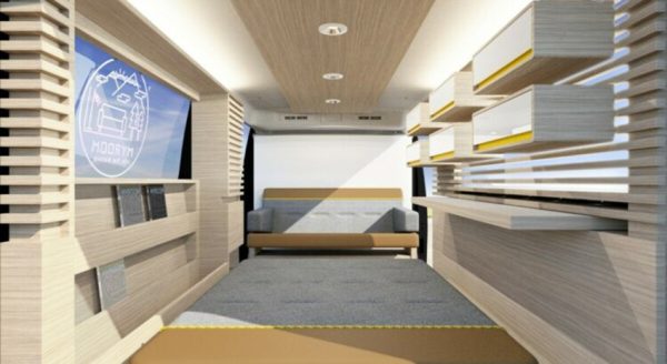 Le second concept se révèle plus discret extérieurement avec sa teinte gris clair et son toit blanc. Le Nissan Caravan Myroom repose sur de simples jantes en tôle noires équipées de pneumatiques classiques. Il conserve un look proche du NV350 Premium GX d'origine. Son habitacle se montre plus accueillant pour les amateurs de voyages tout confort, avec un grand couchage escamotable pour deux personnes. Son ambiance se montre très chaleureuse, avec une boiserie claire. De nombreux rangements sont placés sur chacune des parois latérales. Un canapé, occupant toute la largeur du véhicule, est adossé au poste de conduite. Aucune kitchenette ne semble prévue pour envisager de prendre ses repas à bord.
