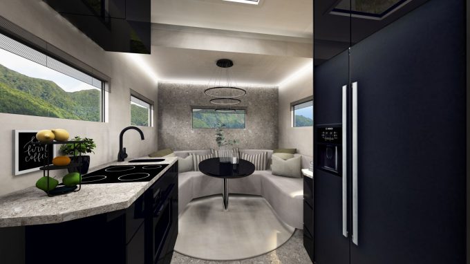 La partie habitable fait la part belle à une décoration sobre (noir et blanc), mais luxueuse, avec des assises habillées de cuir et d’Alcantara. L'implantation privilégie la convivialité avec un généreux salon arrière en U avec une table ovale. A la nuit tombée, cet espace se transforme en chambre grâce à un lit électrique (200 x 200 cm) dissimulé dans le pavillon. Un second couchage de mêmes dimensions est proposé à l'avant, en capucine. Il est accessible grâce à une échelle, et offre un bon tirant d'air grâce à un toit rehaussable motorisé et illuminé par trois baies.