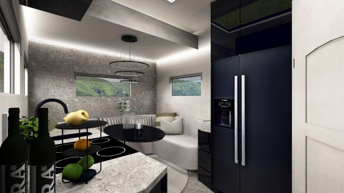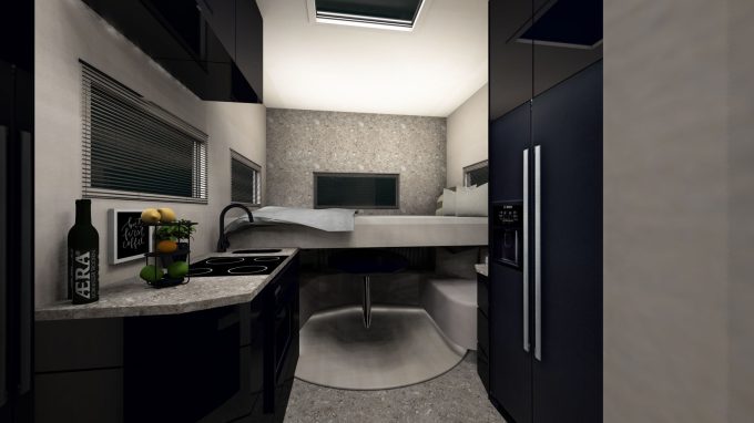 Côté cuisine, les matériaux se montrent tout aussi "simples" (grès façon marbre avec inserts noir graphite) avec un agencement bien pensé. Le meuble principal accueille un beau plan de travail, un évier, une plaque de cuisson à induction à quatre foyers, ainsi qu'une hotte aspirante. Lui font face un véritable réfrigérateur américain, à double porte avec une section congélation, et un four. La salle d'eau, dotée d’une douche, d’un lavabo, d'un WC, complétée par des rangements et un sèche serviette électrique, prend place à l'avant, derrière le poste de conduite. Le tout est approvisionné par une réserve d'eau claire de 400 l (150 l prévus pour les eaux grises). Pour réguler parfaitement la température, selon les conditions météo, une climatisation automatique et un système de chauffage par le sol ont été combinés.