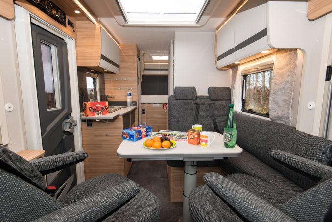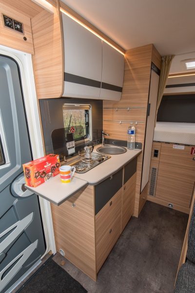 Le salon se compose d'une banquette avec retour et des sièges pivotants de la cabine. Là aussi, tout est réalisé pour accueillir comme il se doit 4 convives. La cuisine, quant à elle, affiche une certaine fonctionnalité avec des proportions pourtant contenues. Rien ne manque en matière d'équipements entre réchaud 2 feux, évier Inox, frigo de 142 l AES, rangements variés... sans oublier la tablette escamotable pour augmenter le plan de travail.
