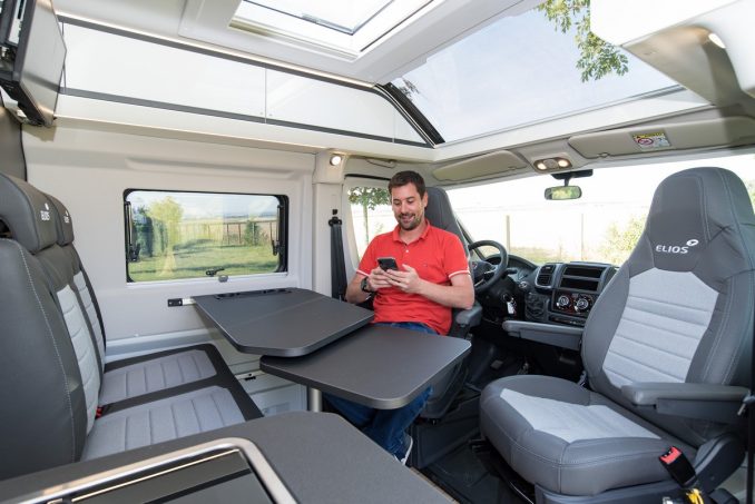 Place donc, cette saison, au Sky-Lift, une gamme composée de deux modèles phares : Elios ayant retenu le 59 T, fourgon de 5,99 m avec lit transversal, et le 63 GX, d’une longueur de 6,36 m avec lit de pavillon arrière. Produits dans les usines Adria, ils ne profitent pas toutefois du système d’ouverture en ciseaux comme leur cousin, mais d’un pantographe plus classique. Leur ligne reste fluide et discrète avec seulement 10 cm de plus en hauteur que les modèles standards. Ces deux nouveautés profitent, en revanche, d’une toile acrylique qu’il est possible d’ouvrir à 180°.