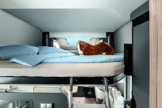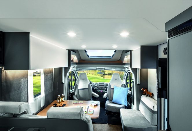 A bord, l'agencement relève d'un grand classique avec lit transversal sur soute, salon pour 4, salle d'eau avec WC et douche dans un unique compartiment séparé par un rideau Nylon. La cuisine fait preuve d'innovation et d'élégance avec un mobilier conçu en trois niveaux : le premier reçoit un plan de travail, le deuxième un réchaud avec rangement et, enfin, le troisième loge un frigo à compression surmonté d'un évier. Au même titre que le Tourer Lift, aucun tarif n'a encore été communiqué pour cet Innovan 590.