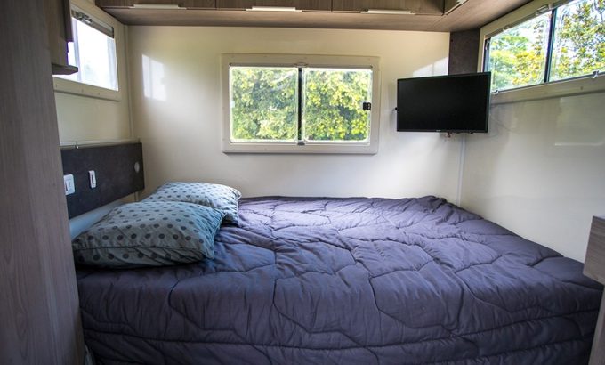 A l'avant, prend place un salon à une ou deux places avec un plateau de table repliable.